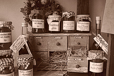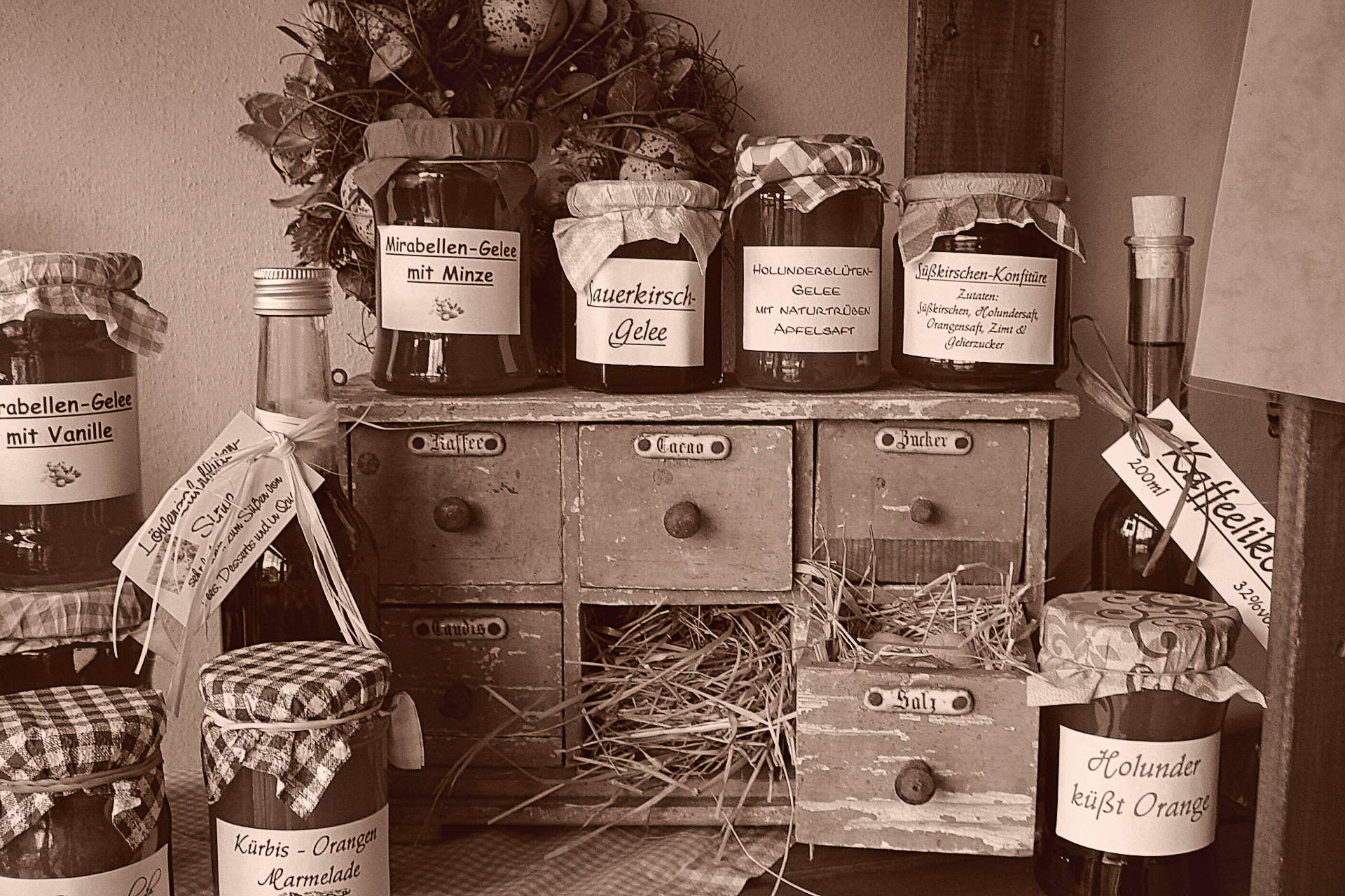 In unserem Hofladen bieten wir hauptsächlich von Hand gemachte Spezialitäten an, darunter verschiedene Liköre, Sirup, fruchtige Aufstriche, sowie Ahle Wurscht aus Nordhessen.